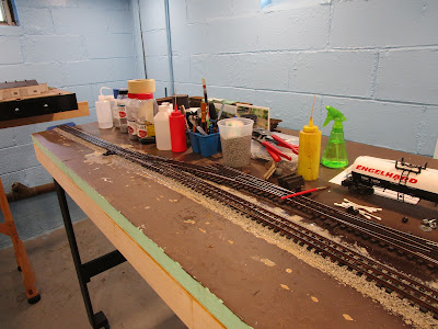 What I didn't count on was the exact spot of rail I had chosen to remove was the place where the middle rail feeder wire was. Grrrr. Thankfully, the switch leading up to it was power-routing switch that I had added jumpers to, and in fact the feeder wire I had cut wasn't necessary as power was still getting there anyway. After testing it to confirm that I was okay, I pulled the feeder out and plugged the hole underneath with caulk.